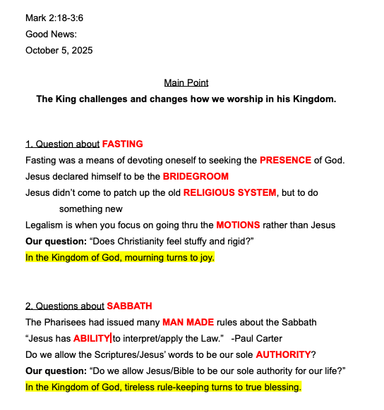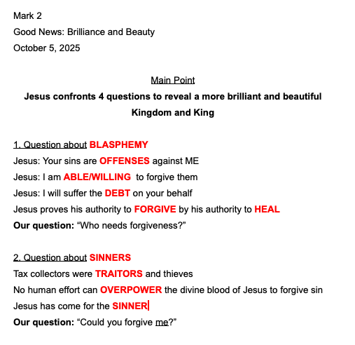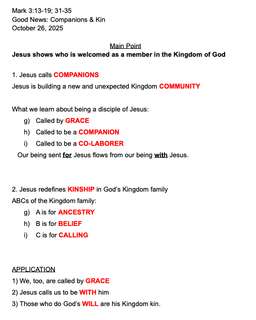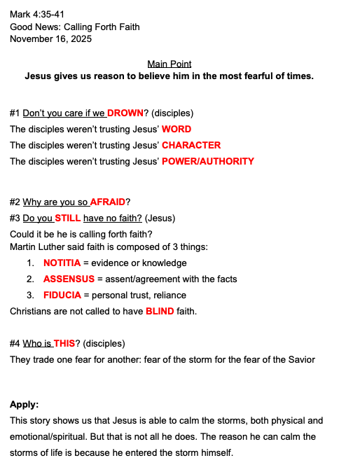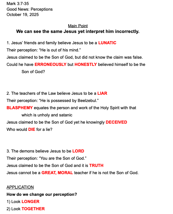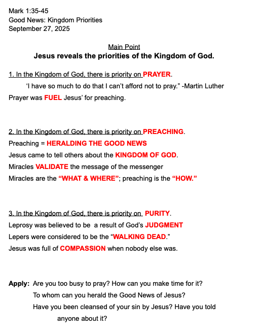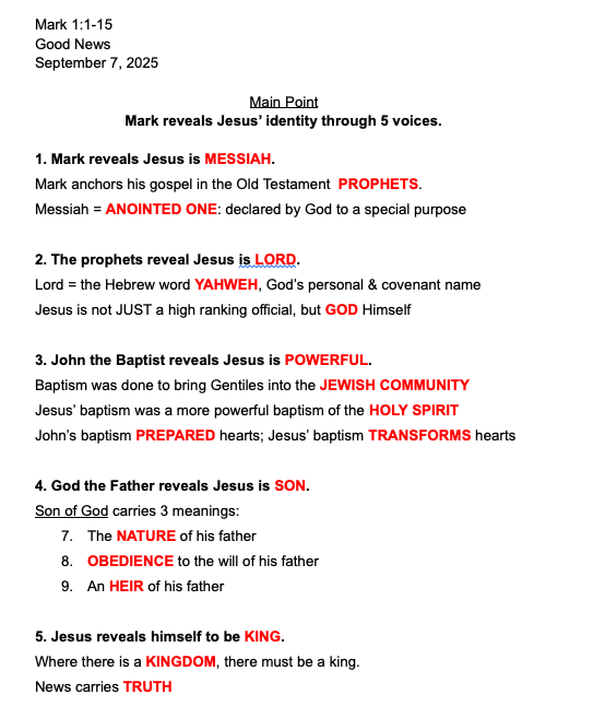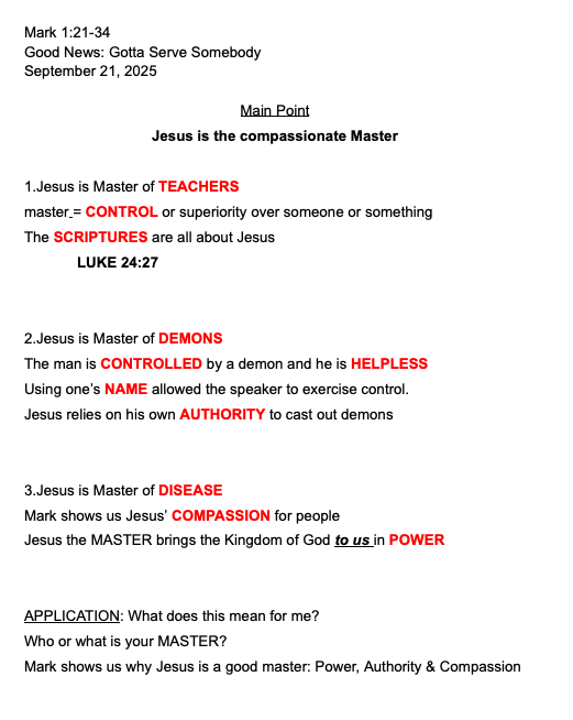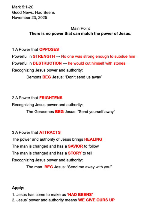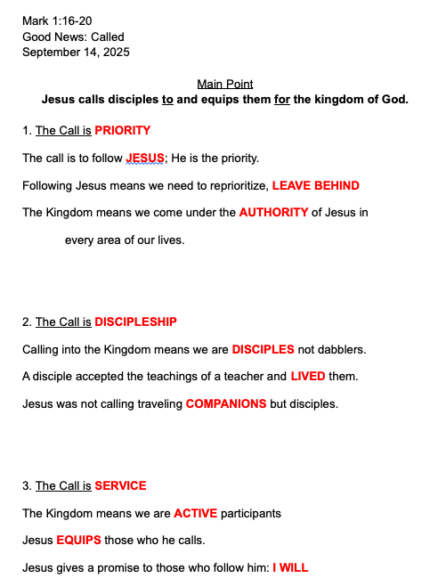 SERMON NOTES: Mark #12 | November 23 | Mark 5:1-20 | Good News; Had BeensDownload #11 | November 16 | Mark 4:35-41 | Good News: Calling Forth FaithDownload #1 | September 7 | Mark 1:1-15 | Good NewsDownload #10 | November 9 | Mark 4.21-34 | Good News: Light and SeedDownload #9 | November 2 | Mark 4:1-20 | Good News: Kingdom SoilDownload #8 | October 26 | Mark 3:13-19; 31-35 | Good News: Companions & KinDownload #7 | October 19 | Mark 3:7-35 | Good News: PerceptionDownload #6 | October 12 | Mark 2:18-3:6 | Good News: ChangesDownload #5 | October 5 | Mark 2:1-17 | Good News: Brilliance and BeautyDownload #4 | September 28 | Mark 1:35-45 | Good News: Kingdom PrioritiesDownload #3 | September 21 | Mark 1:21-34 | Good News: Gotta Serve SomebodyDownload #2 | September 14 | Mark 1:16-20 | Good News: CalledDownload Share this: Click to share on X (Opens in new window) X Click to share on Facebook (Opens in new window) Facebook Like Loading...